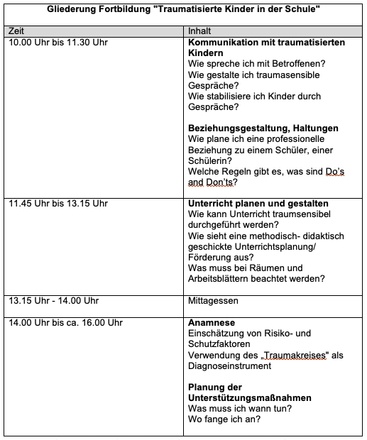 - Vermittlung von Handlungssicherheit im Umgang mit traumatisierten Schülern und Schülerinnen.