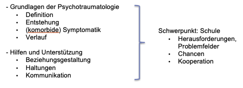 - Vermittlung von Handlungssicherheit im Umgang mit traumatisierten Schülern und Schülerinnen.